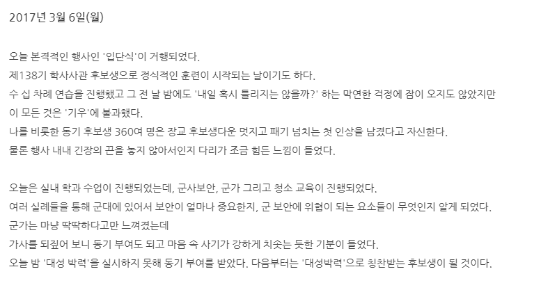 | 공군학사장교 훈련일지 프롤로그 (1/2) (385) | 2020.03.30 |